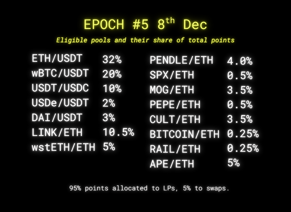 Launched in early November 2025, it focuses on Ethereum L1 ecosystem tokens like $APE, $PENDLE and $CULT. To earn points, users will be providing concentrated liquidity in any ranges (with no lock restrictions) or by swapping in whitelist pools like APE/ETH, PENDLE/ETH and BITCOIN/ETH.