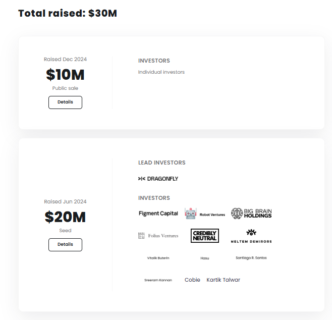 - $20M from the Seed round, led by Dragonfly, along with other investors such as Robot Ventures, Big Brain Holdings, Figment Capital, Vitalik Buterin, and Santiago R. Santos, etc.