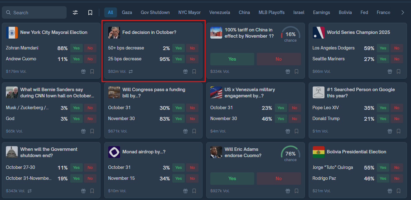Example: Let's choose to bet on "Fed decision in October?". For this market, Polymarket will take results from official Federal Reserve announcements.