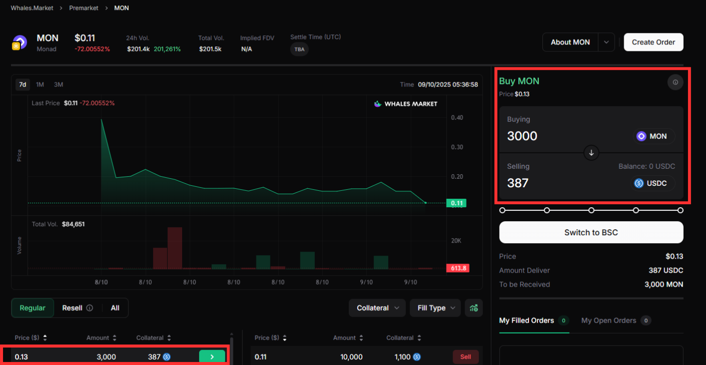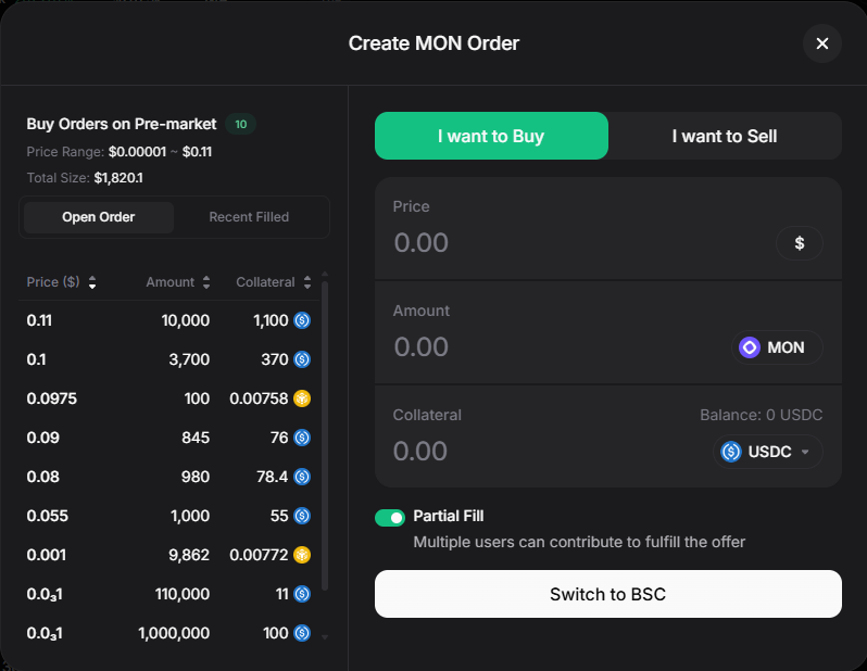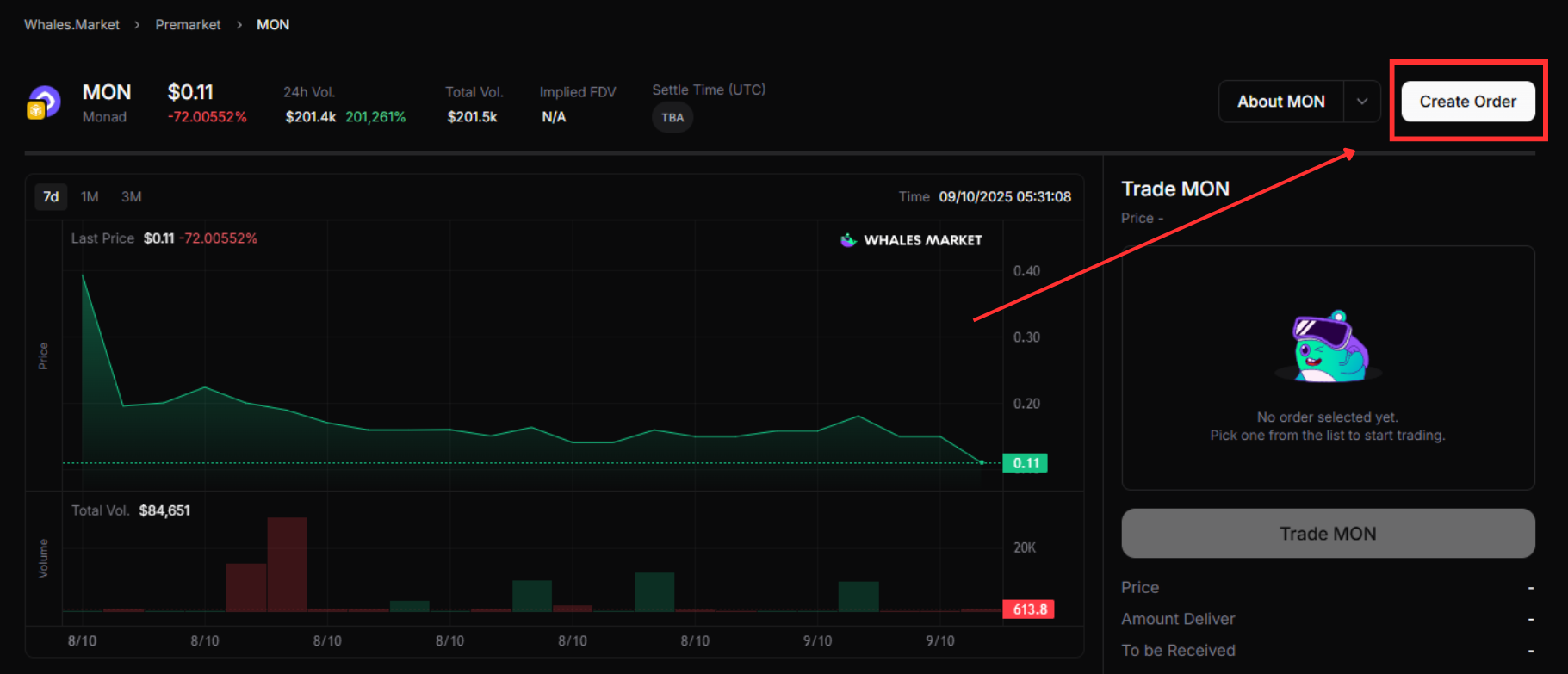 If you want to buy $MON before listing, or sell your token allocation at your preferred price, simply click “Create Order” button on the platform.