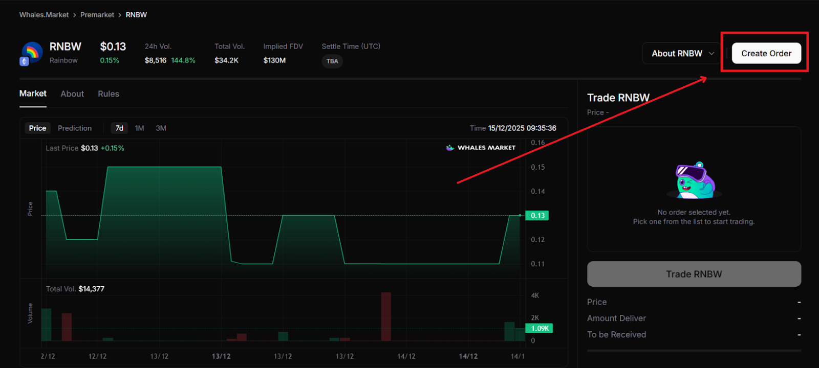 If you want to buy $RNBW before listing, or sell your token allocation at your preferred price, simply click “Create Order” button on the platform.