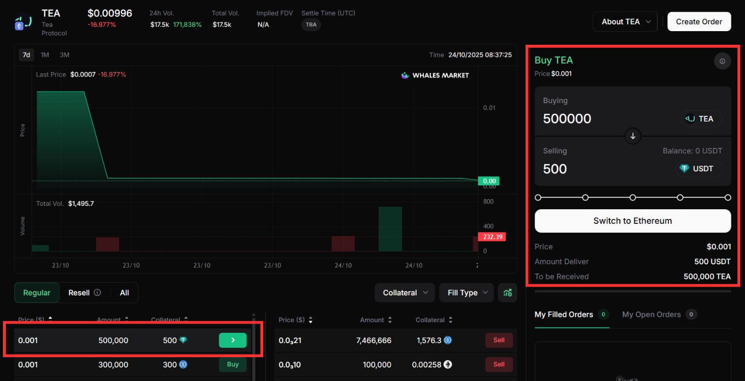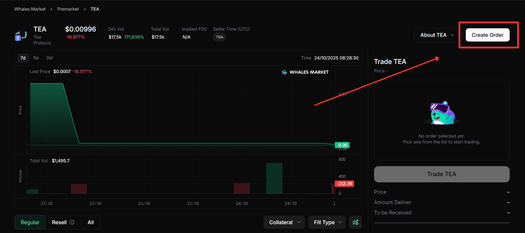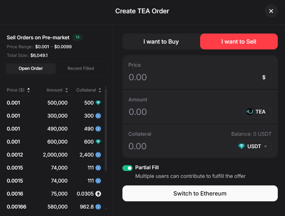 You can buy or sell pre-TGE $TEA on Whales Market by creating or filling orders with collateral-based settlement.