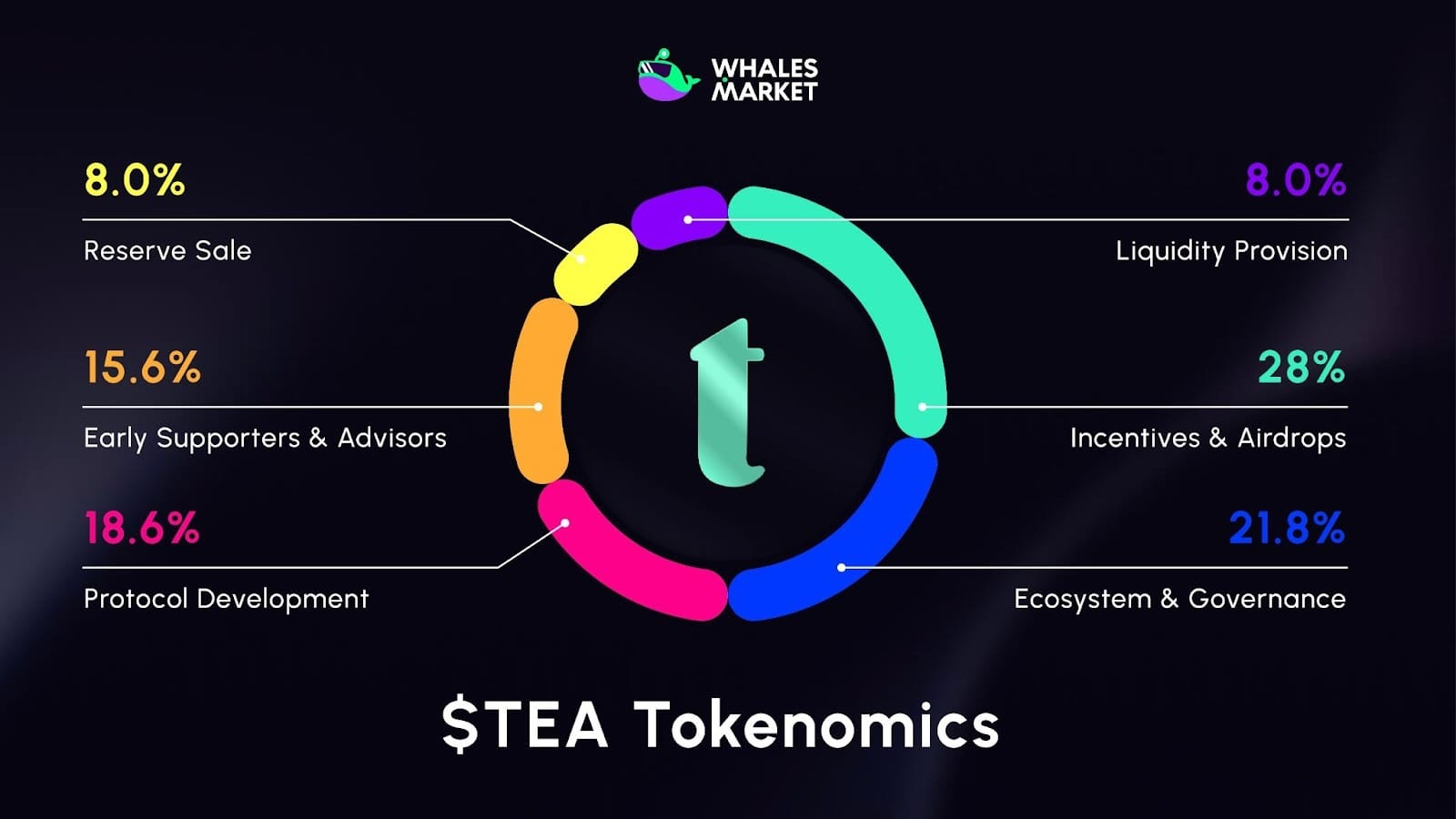The $TEA token is distributed as follows: 28% for incentives and airdrops, 21.8% for ecosystem and governance, 18.6% for protocol development, 15.6% for early supporters and advisors, and 8% each for reserve sale and liquidity provision.