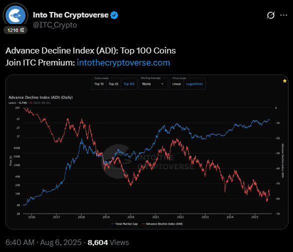 The Advanced Decline Index (ADI) for the top 100 cryptocurrencies reveals a disturbing pattern since 2021: declining altcoins consistently outnumber advancing ones, even as overall market cap climbs. This metric exposes the harsh reality that most tokens are bleeding while only a select few thrive.