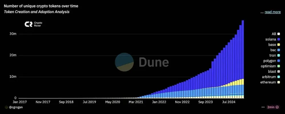 37 million tokens compete for liquidity versus 3 million in 2021. Massive unlocks and institutional focus on Bitcoin/Ethereum starve altcoins.