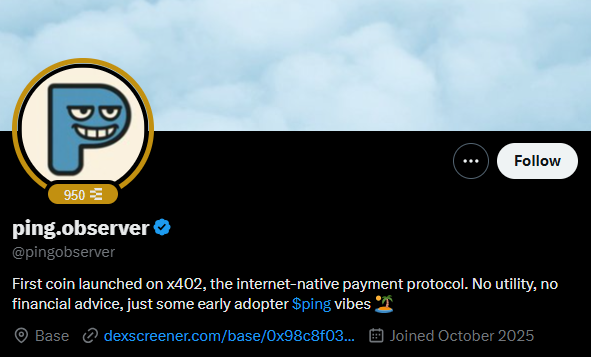 PING is the first memecoin on the x402 protocol, running on Base blockchain, combining meme energy with experimental internet-native payment technology for AI agents under the slogan "no utility, just early adopter vibes."