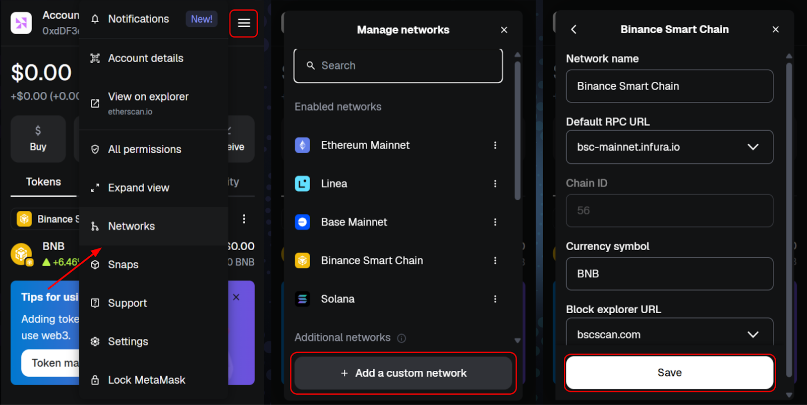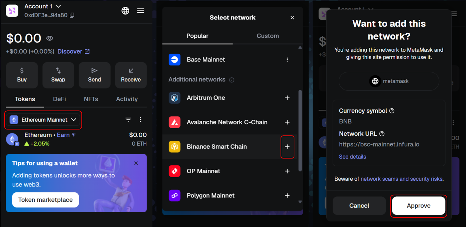 By default, MetaMask connects to the Ethereum network. To use other blockchains such as BNB Chain or Base, you need to add them: