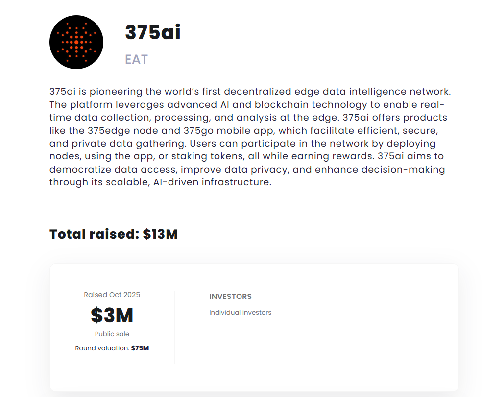 375ai is a distributed network system specializing in edge data intelligence, built on Solana. This platform focuses on collecting, processing, and analyzing data from the physical world in real time, helping to connect the real world with digital technology.