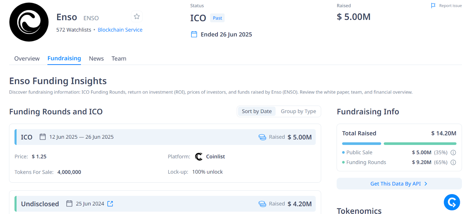 According to CryptoRank , Enso Finance has raised a total of $14.2M in 2 funding rounds, led by Hypersphere Ventures.