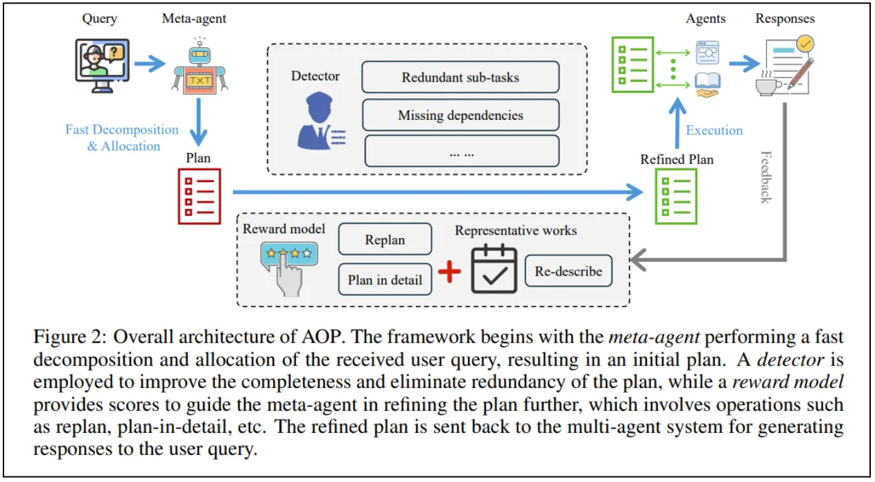 - Detector: Reviews the plan for gaps, redundancies, or dependencies between tasks. It ensures smooth agent coordination and eliminates wasted computation.