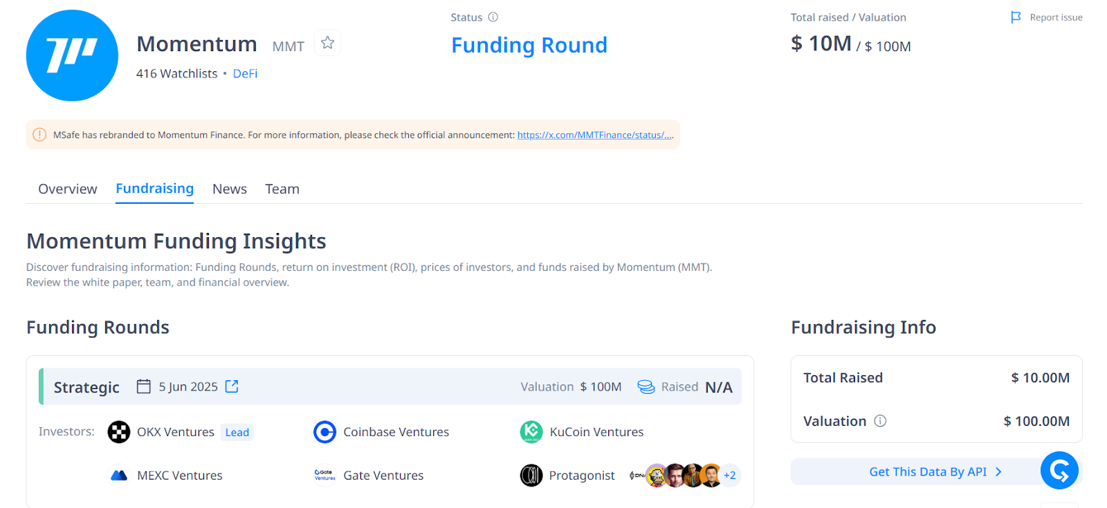 Momentum has raised successfully a total of $10M through 3 funding rounds. Funds and organizations that have invested include: Jump Capital, Spartan, Coinbase Ventures, OKX Ventures, Sui Foundation, Varys Capital, Aptos,...