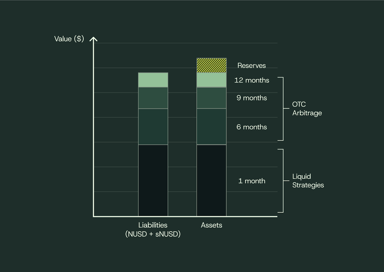 - Backed by redeemable assets: NUSD is supported by liquid stablecoins, hedged positions, and token allocations from OTC deals. A portion is held as immediately redeemable liquidity to ensure smooth withdrawals.