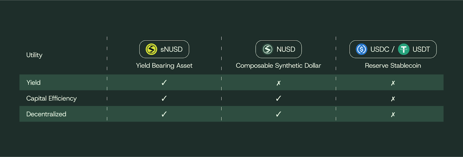 USDC and USDT are fiat-backed stablecoins, while NUSD is a crypto-backed synthetic dollar paired with short futures positions. This structure gives NUSD a fundamentally different risk profile and allows it to earn yield through market-neutral strategies.