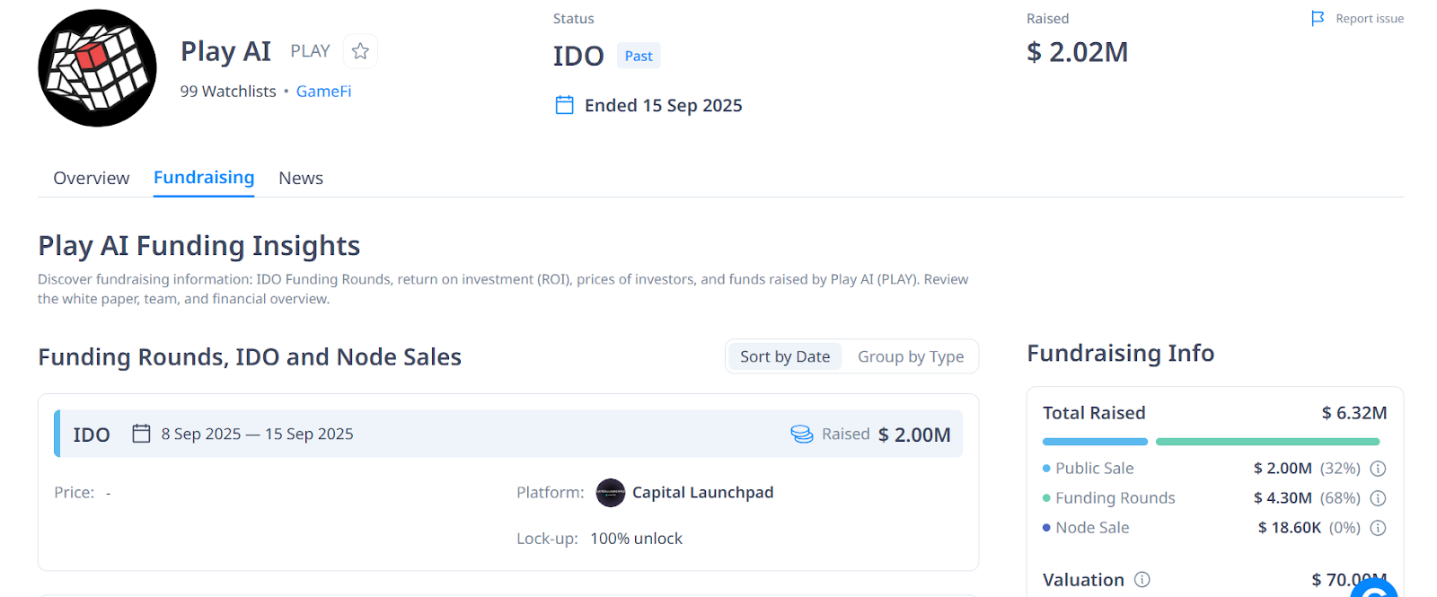 Play AI has raised successfully total of $6.32M across the funding rounds, led by P2 Ventures. In addition, Play AI launched the Public Sale on Capital Launchpad.