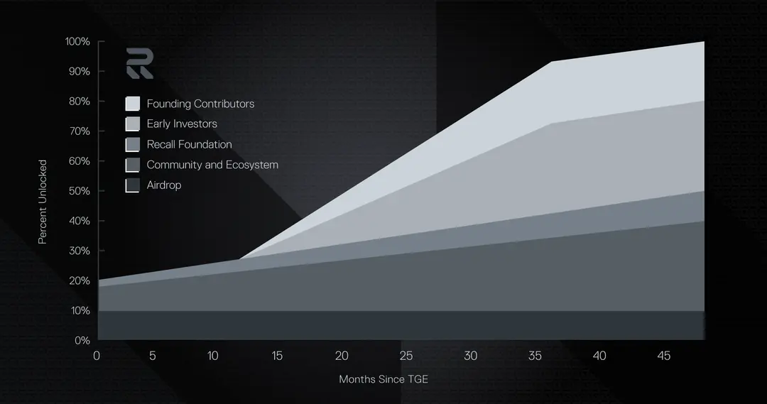 - Founding Contributors (21%): 21% is allocated to founding contributors who spent over seven years building Recall across product, engineering, business development, marketing, and strategy.