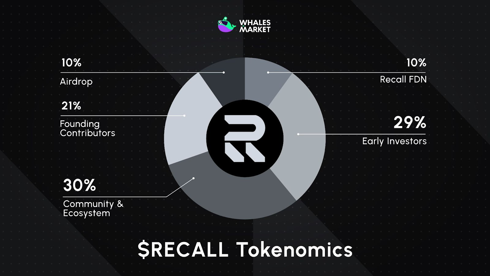 $RECALL has a total supply of 1 billion tokens, allocated as follows: 10% for airdrops and TGE, 10% to the Recall Foundation, 30% for community and ecosystem growth, 21% to founding contributors, and 29% to early investors including Ceramic backers.
