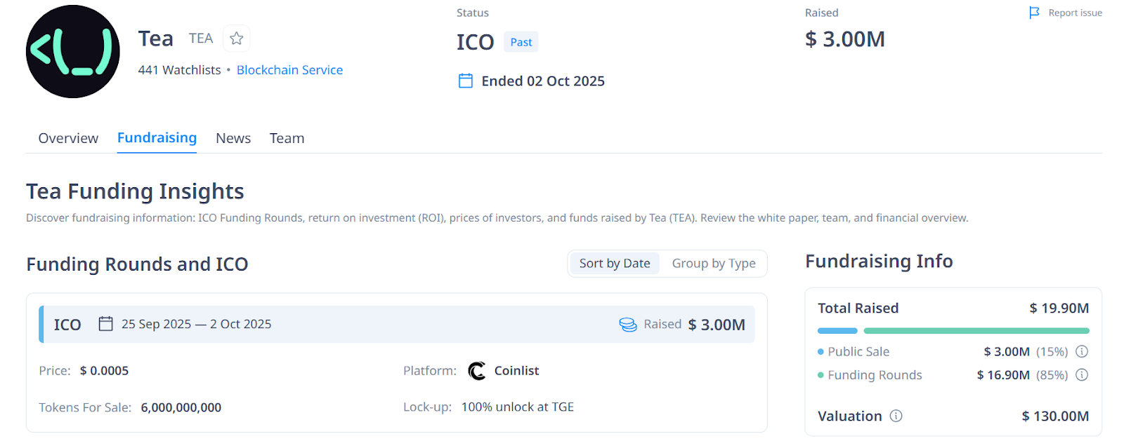 tea Protocol has raised successfully total of $19.9M across the funding rounds, led by Yzi Labs. In addition, tea Protocol launched the Public Sale on Coinlist with $0.0005 per token.
