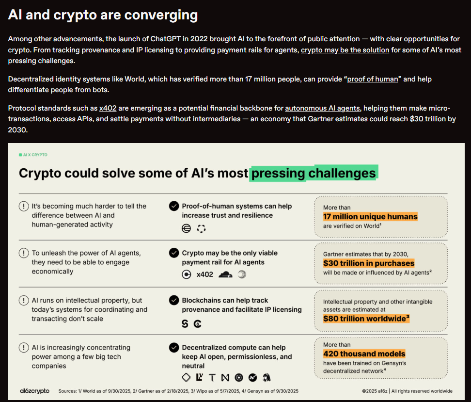 The potential impact is massive. According to a16z’s State of Crypto 2025 report citing Gartner, the autonomous AI agent economy could reach $30 trillion by 2030.