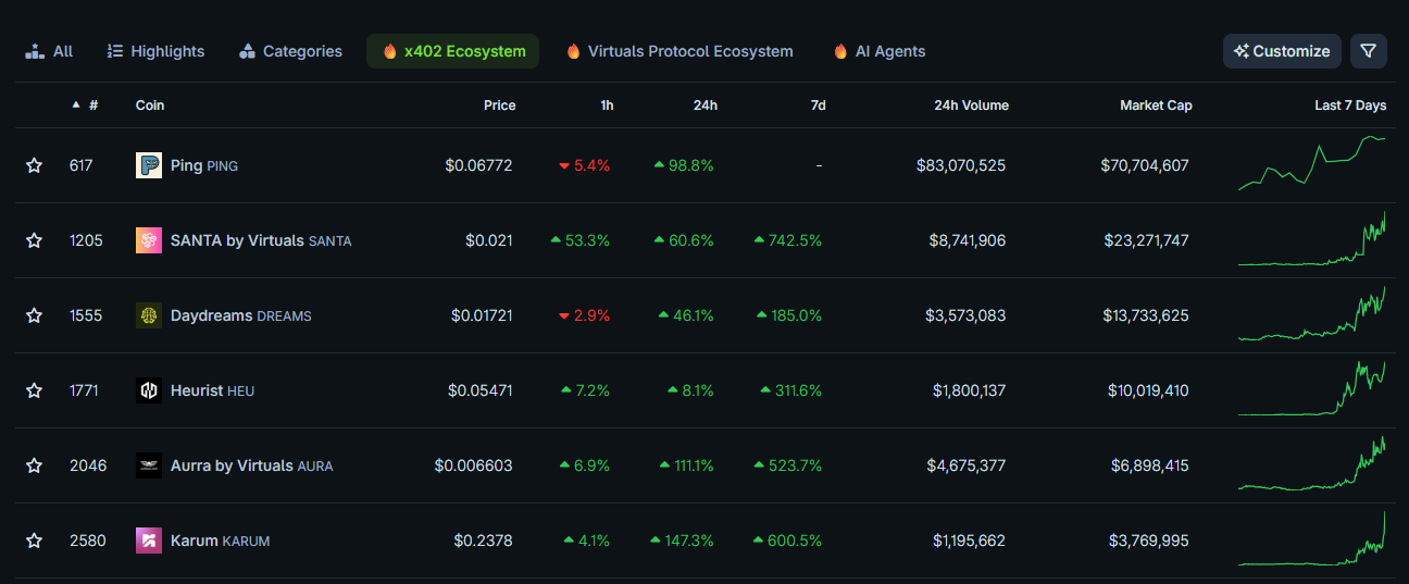 - PING (PING): ~$70M market cap, the core micropayment token in x402, focused on fast API payments.