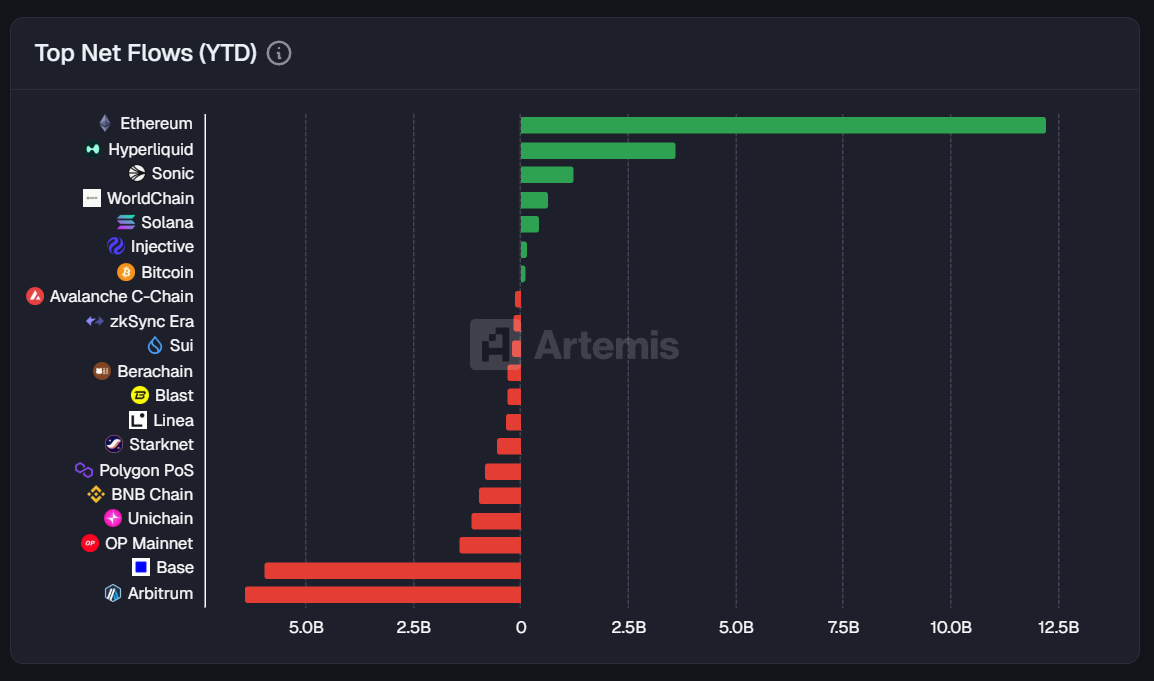 Despite many impressive numbers, Base faces a serious problem: money outflows. Since the beginning of 2025, more than $6.4B has flowed out of Base, mostly back to Ethereum.
