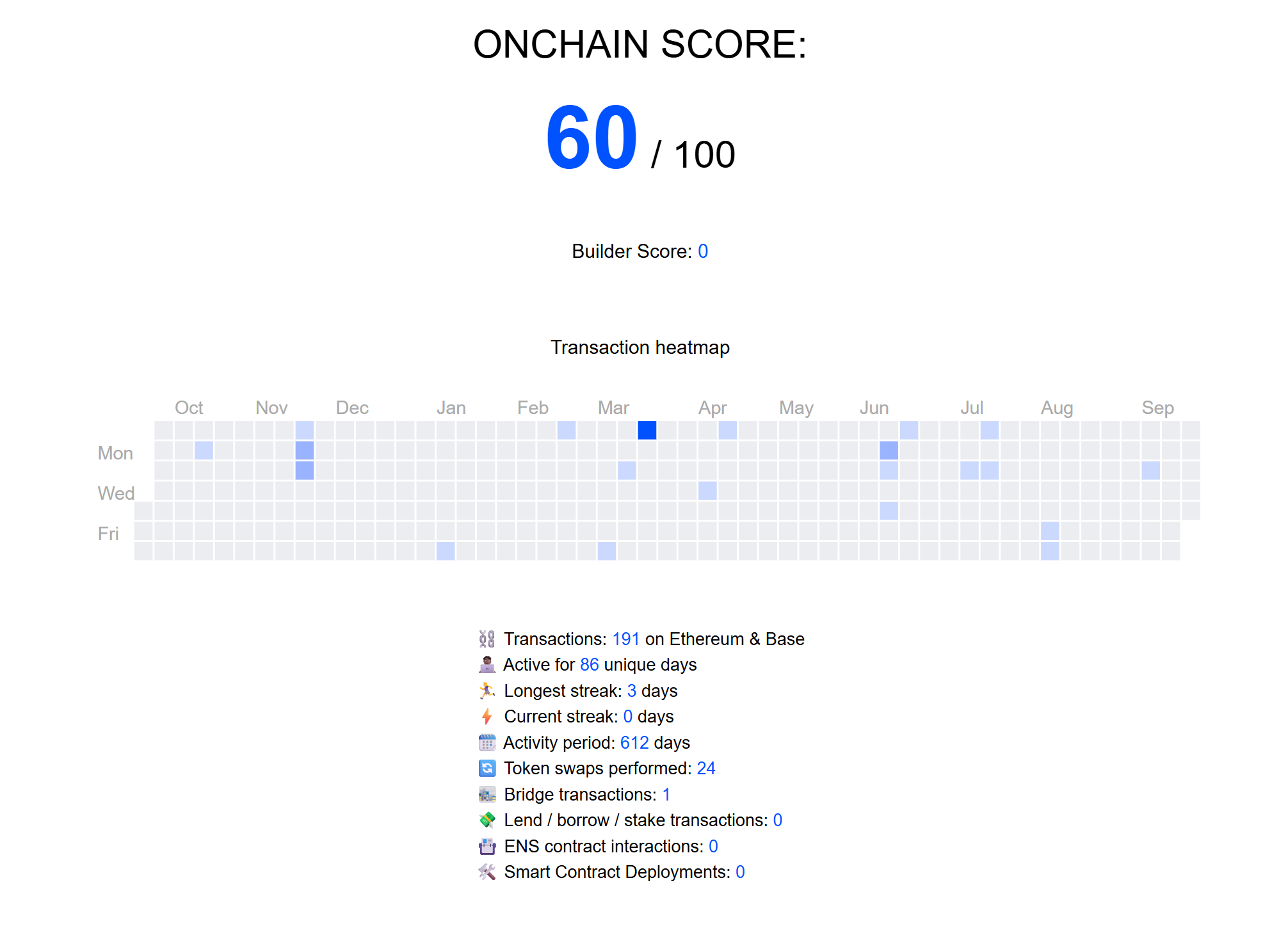 Most believe that if Base launches an airdrop, onchainscore criteria will be central to eligibility. Users can follow this criteria to build a history onchain for their wallet.